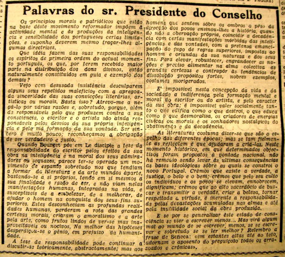 O discurso proferido por Salazar durante a sessão de entrega dos Prémios literários do Secretariado de Propaganda Nacional, em 21 de Fevereiro de 1935, constitu uma síntese das posições do Estado Novo relativamente à liberdade de expressão, de pensamento e de criação dos escritores e artistas. Mais grotesco do que algumas das ideias opressivas e paternalistas do próprio discurso, é o facto deste ter sido publicamente anunciado durante uma cerimónia, uma festa, destinada a celebrar e distinguir a criatividade de escritores e artistas. (Em anexo, com o discurso integral, uma página do "Diário da Manhã, de 22 de Fevereiro de 1935)