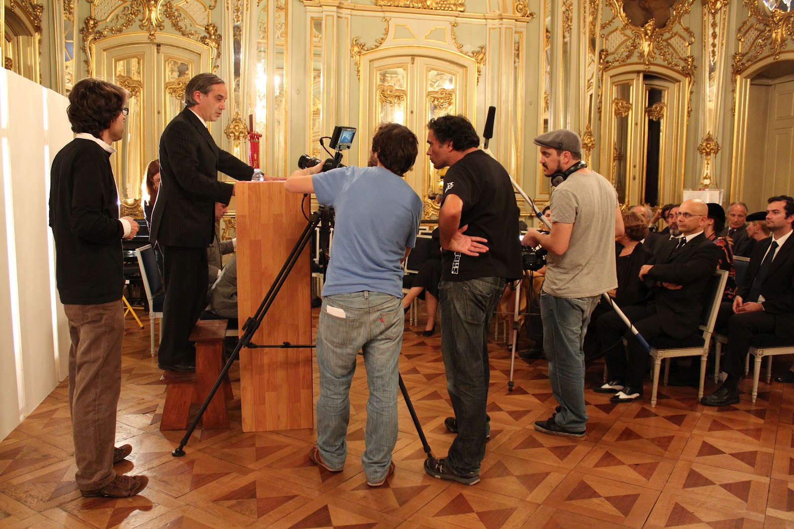 interpreta Salazar) rodeado pela equipa de realização e de produção prepara-se